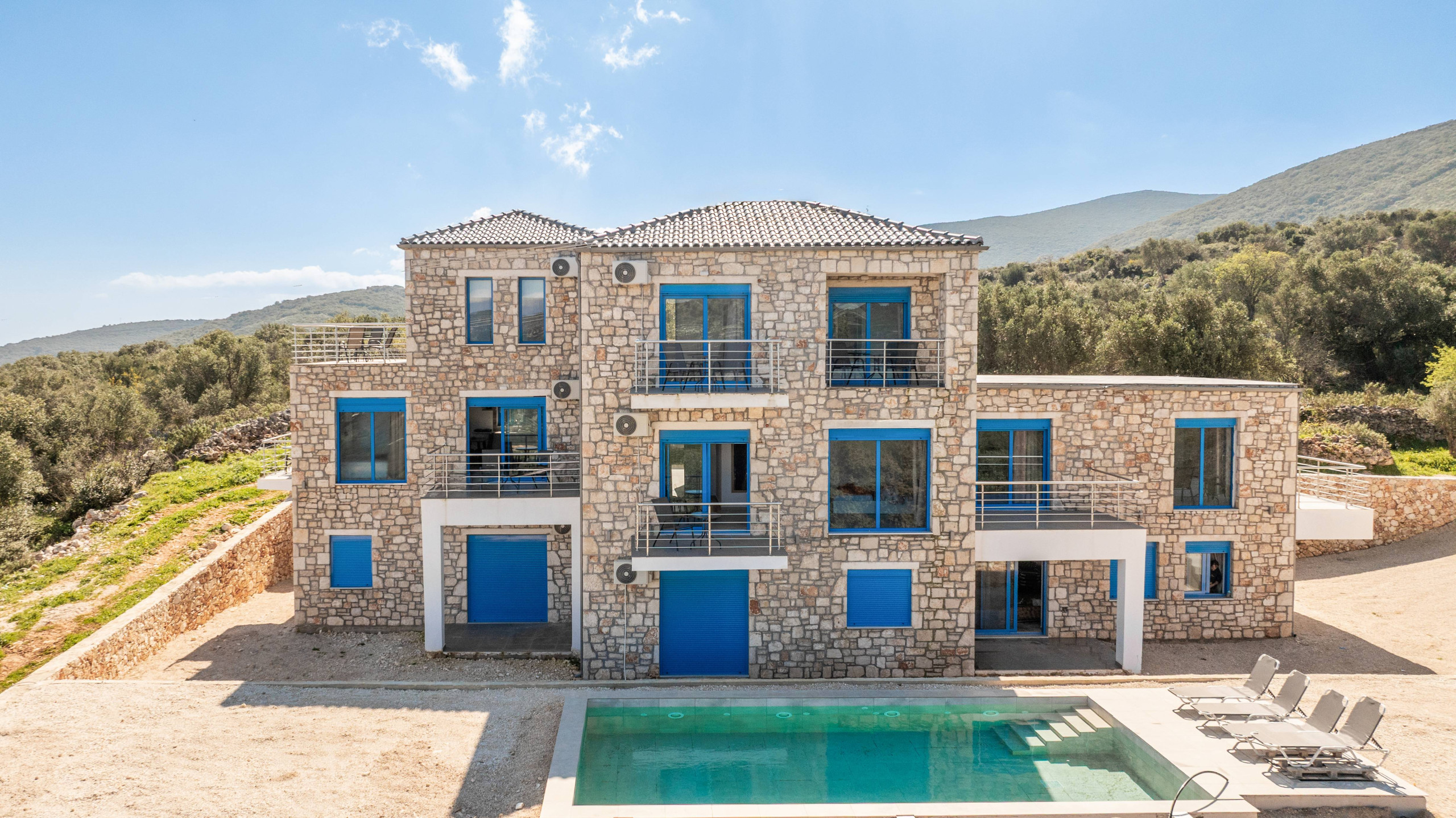 Guests of the complex can also enjoy the shared swimming pool, ideal for cooling off while admiring the scenic views of the Ionian Sea and the surrounding countryside.