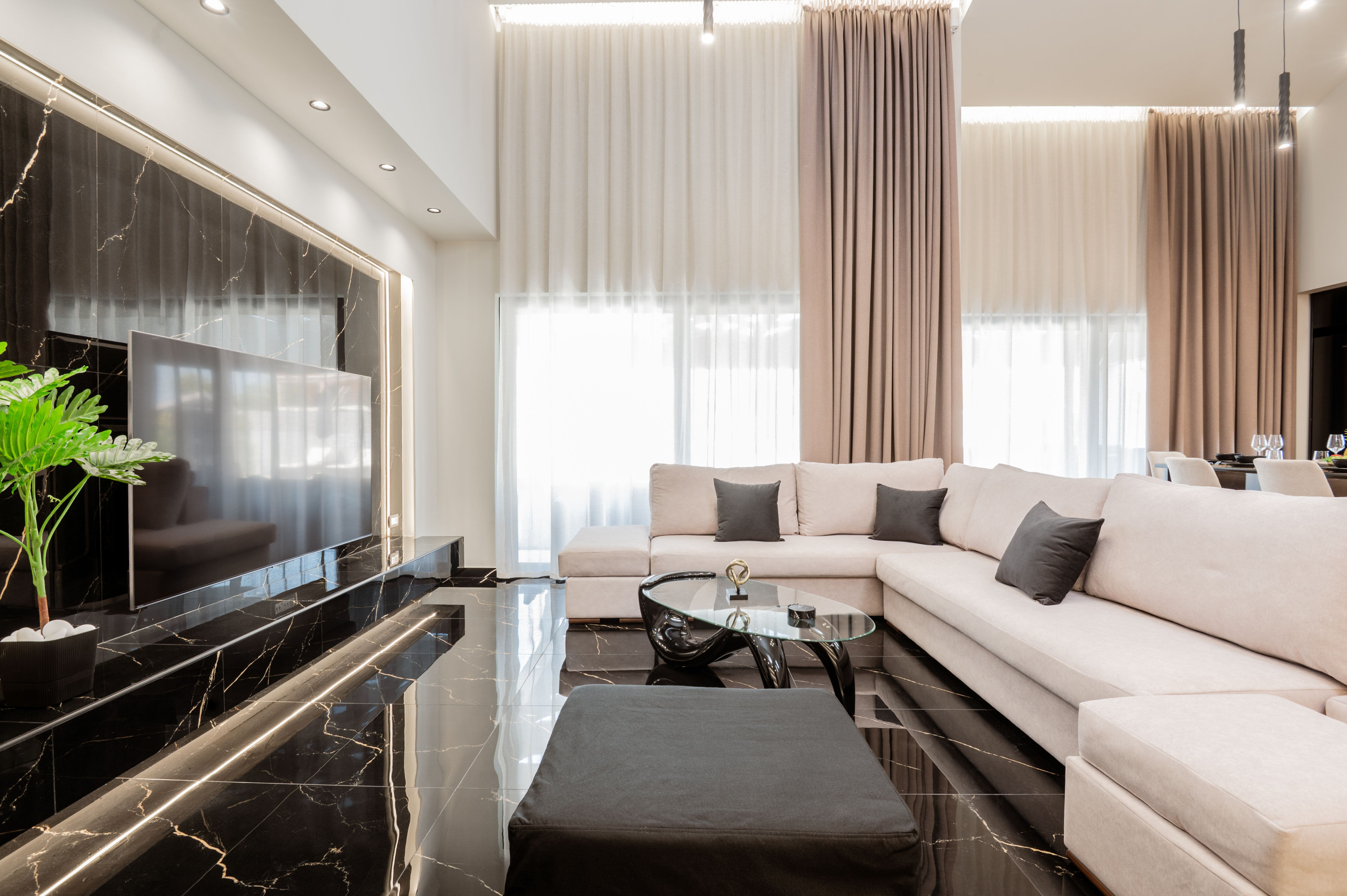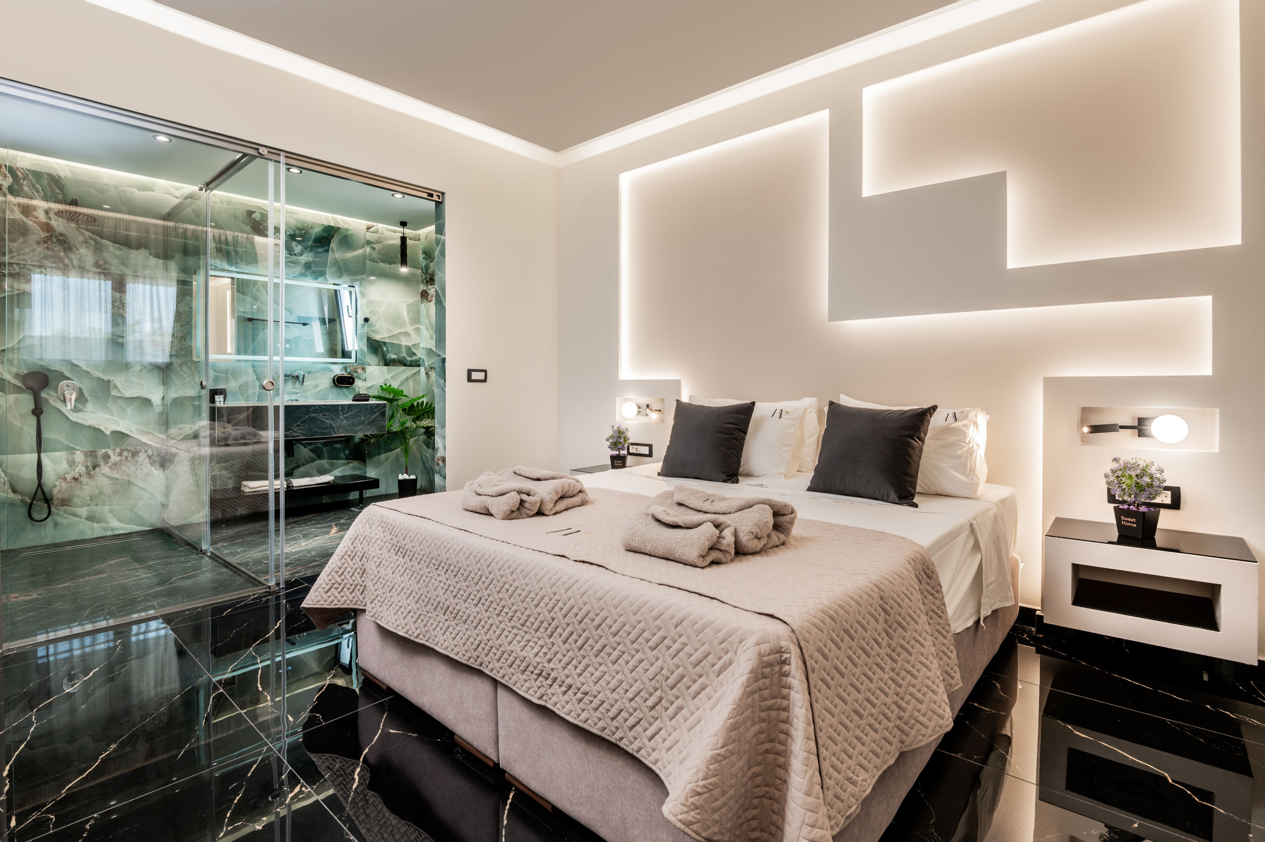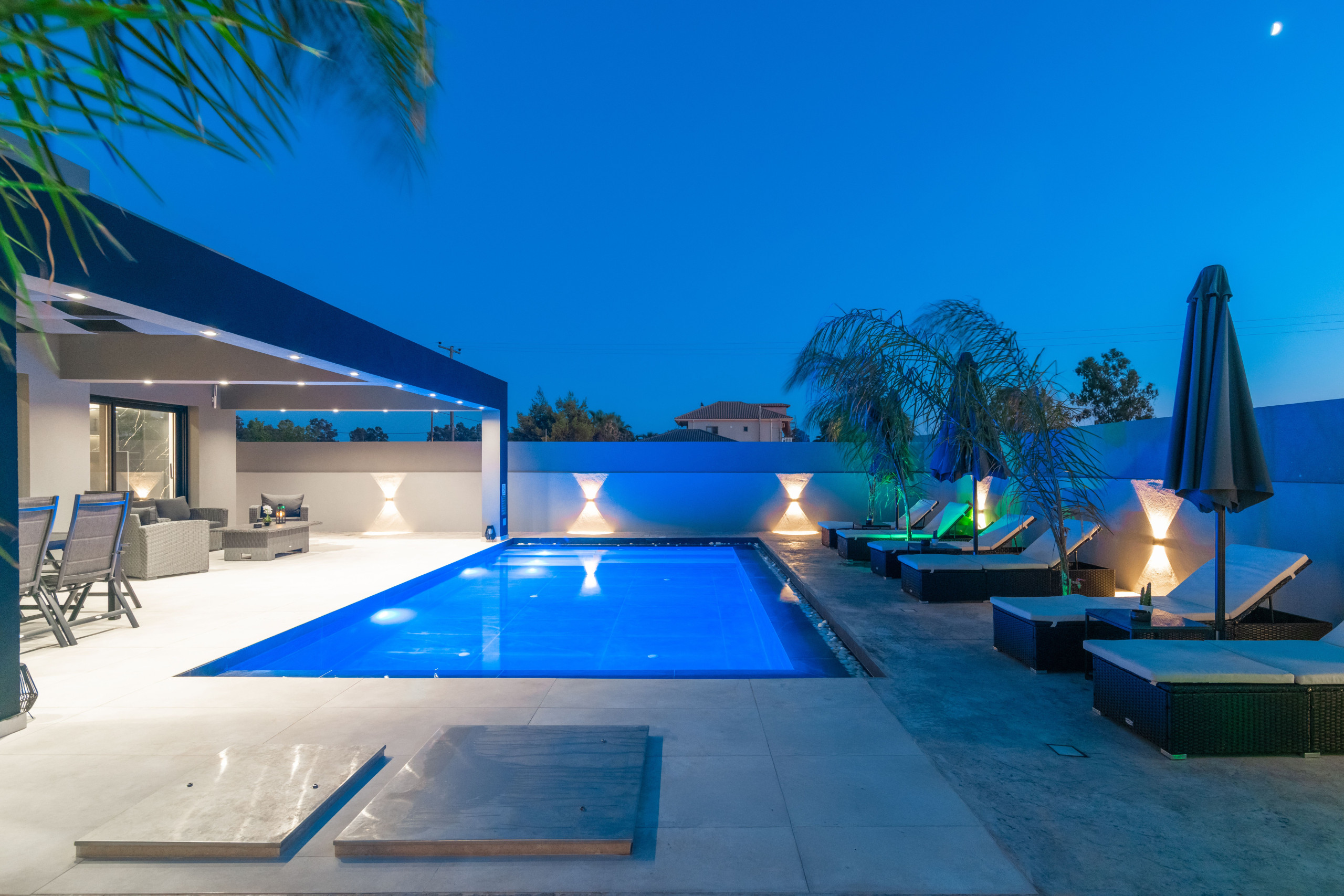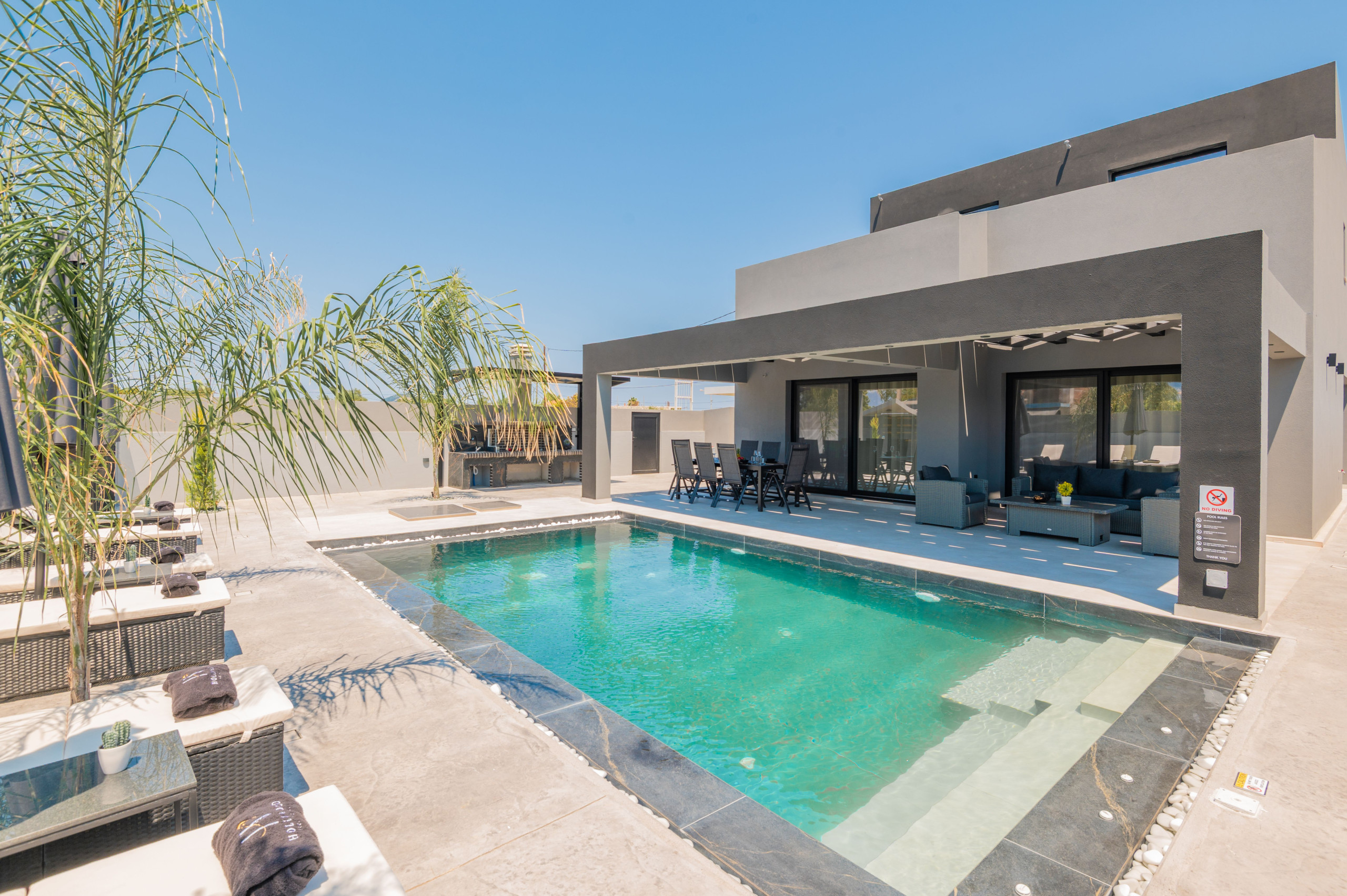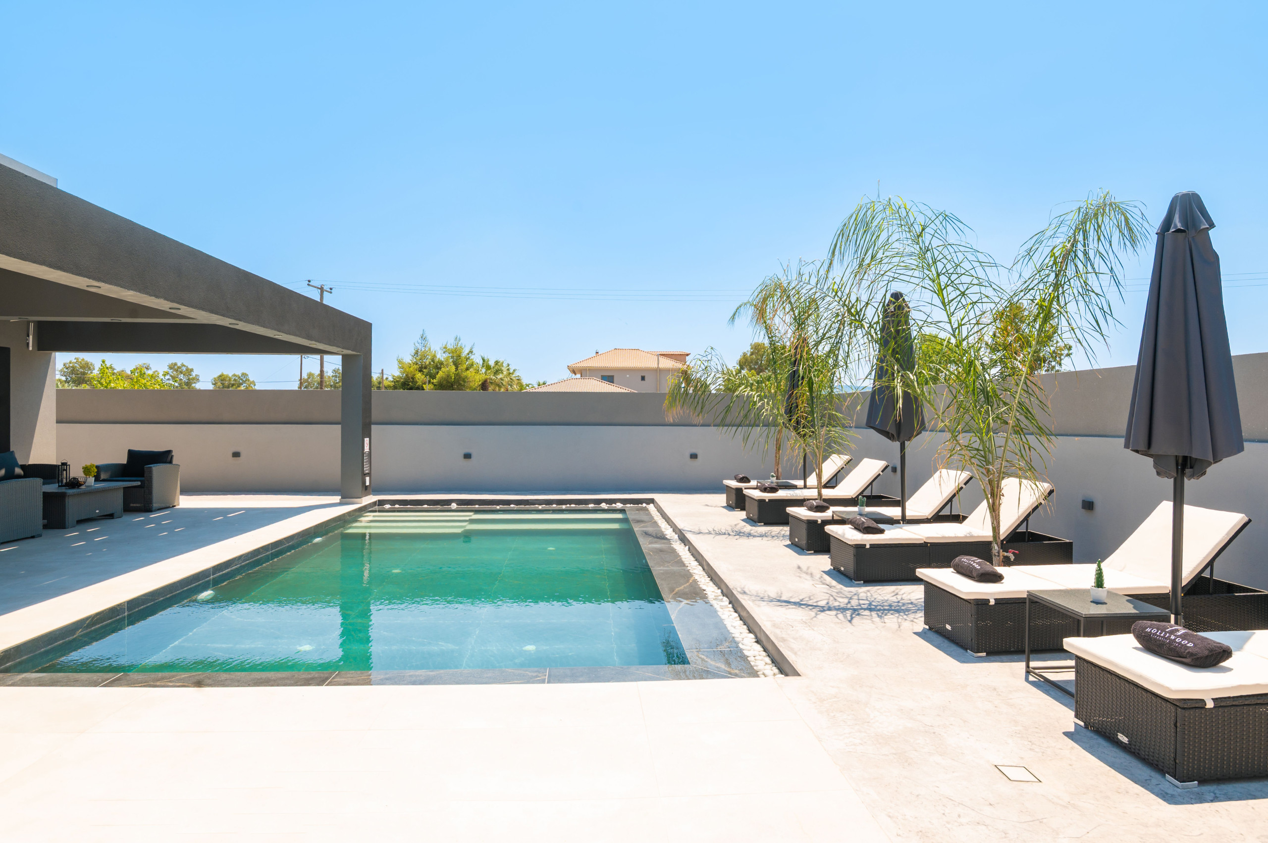 The outdoor area of Hollywood Villa is nothing short of spectacular. The private pool, complete with an integrated jacuzzi, invites you to relax and soak in the sun. Comfortable sun loungers and parasols surround the pool, with plush pool towels provided to enhance your experience.
