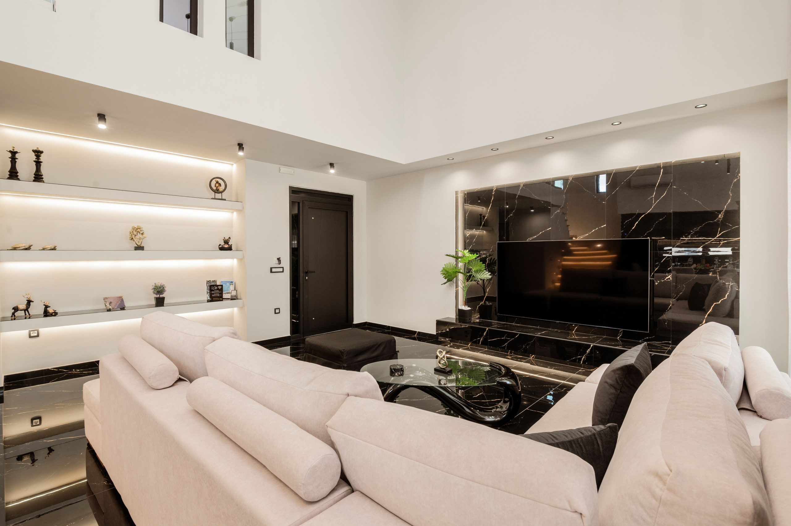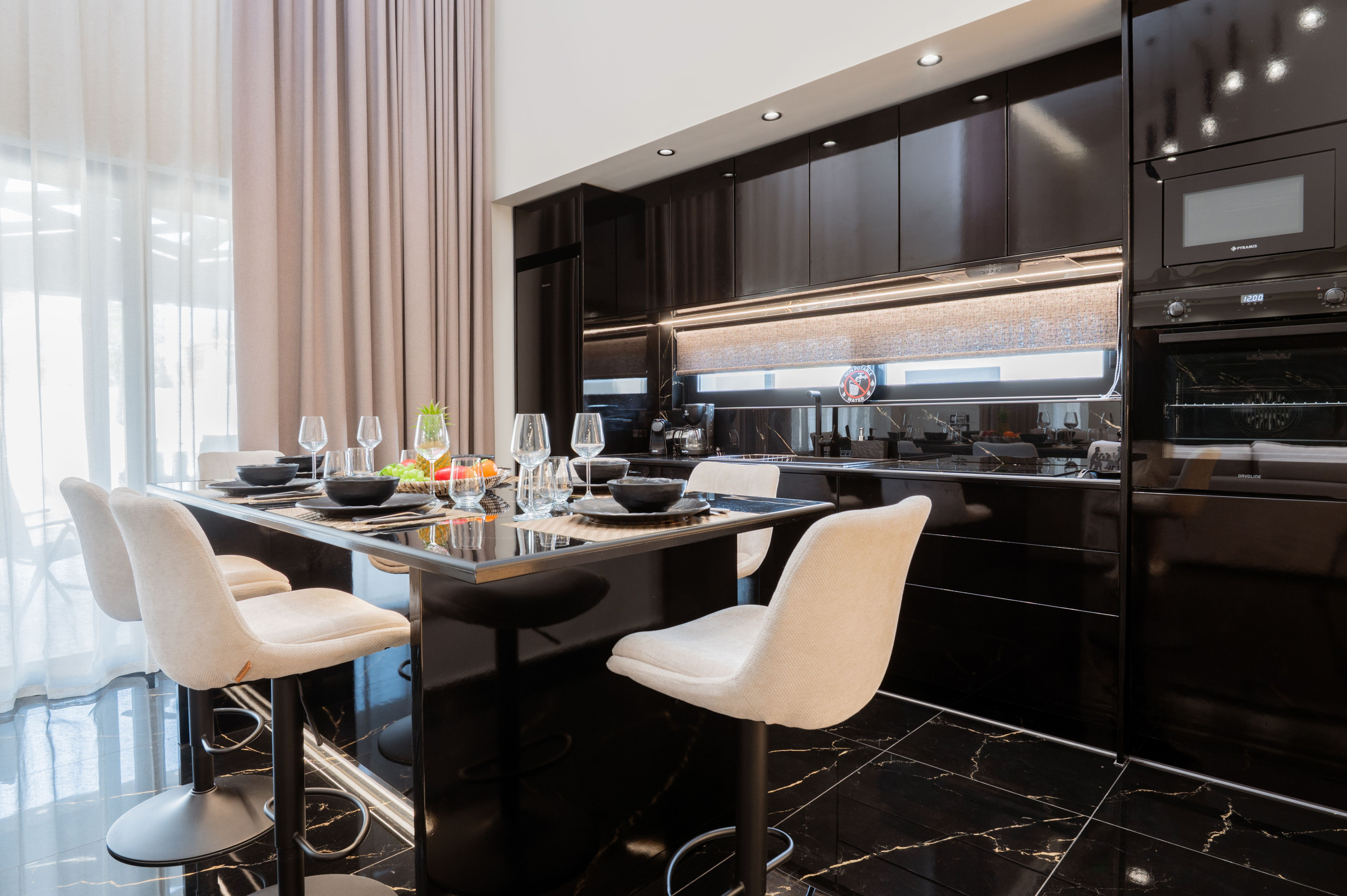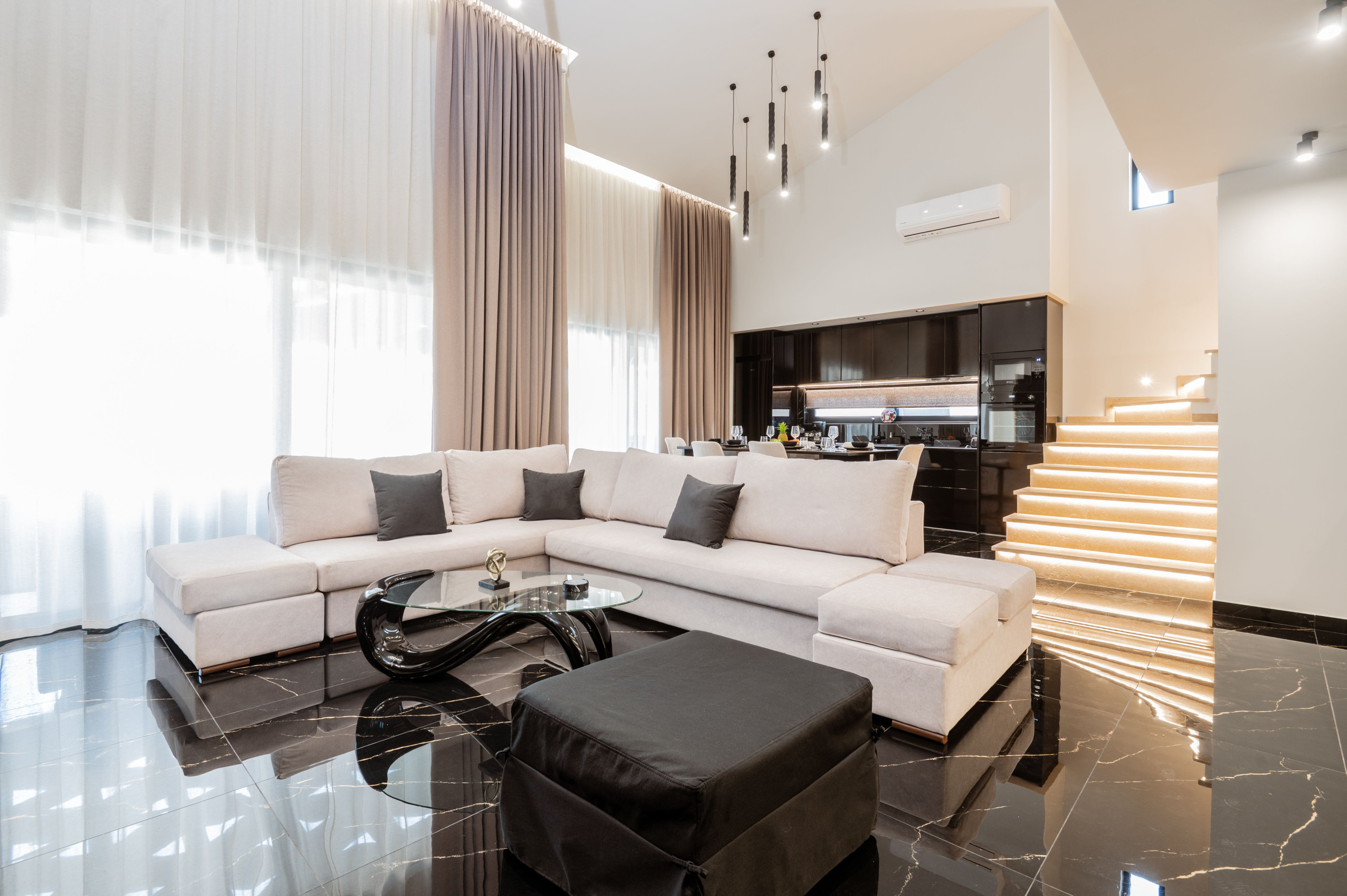 The ground floor offers a warm and welcoming space with an open-concept layout. The living area, complete with a Smart TV, a plush double sofa bed and expansive windows, effortlessly flows into the outdoor terrace and pool area. Adjacent to the living room is a fully equipped kitchen, featuring top-of-the-line appliances like a dishwasher, coffee makers, and all the essentials for preparing delicious meals.
