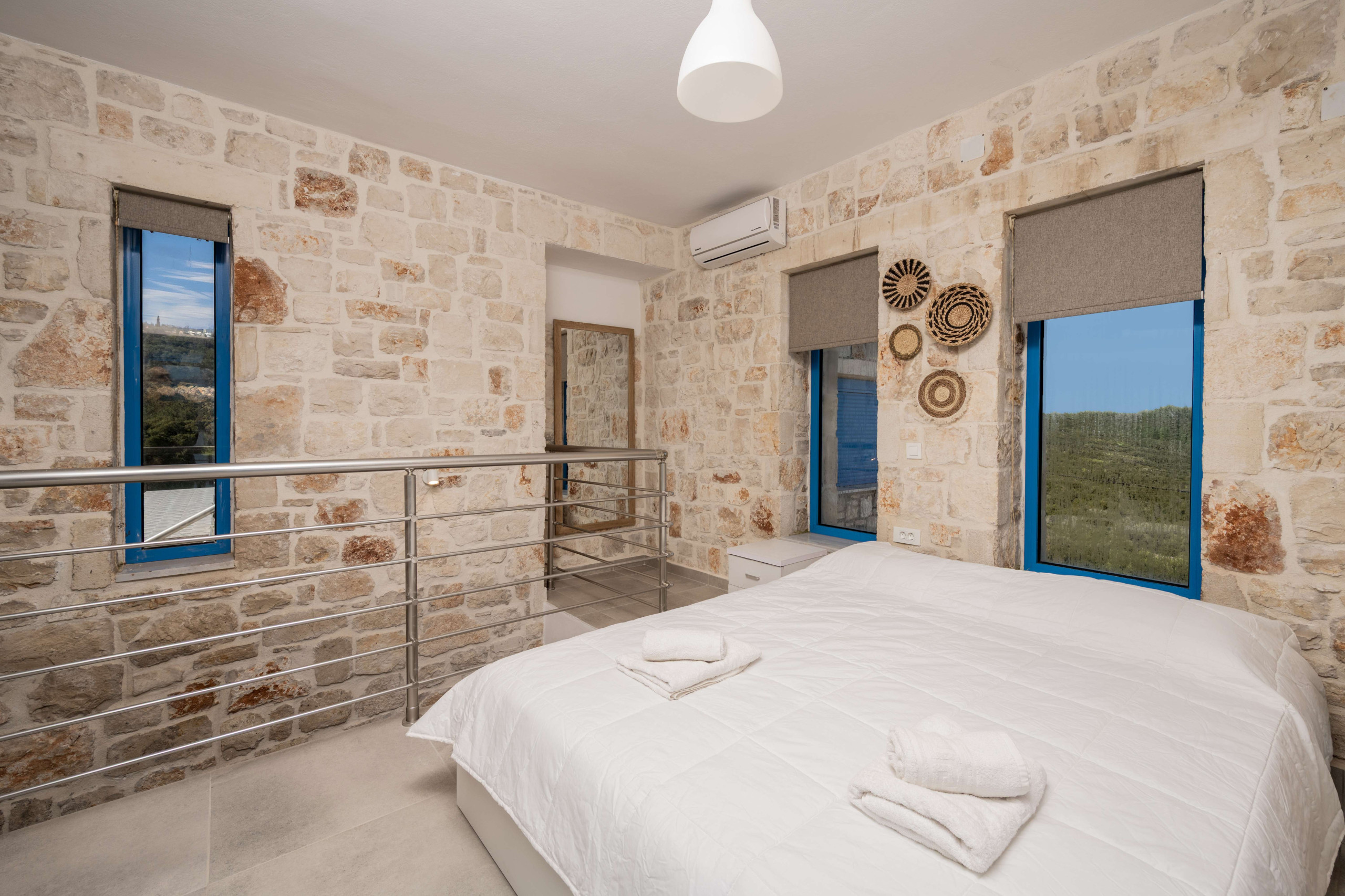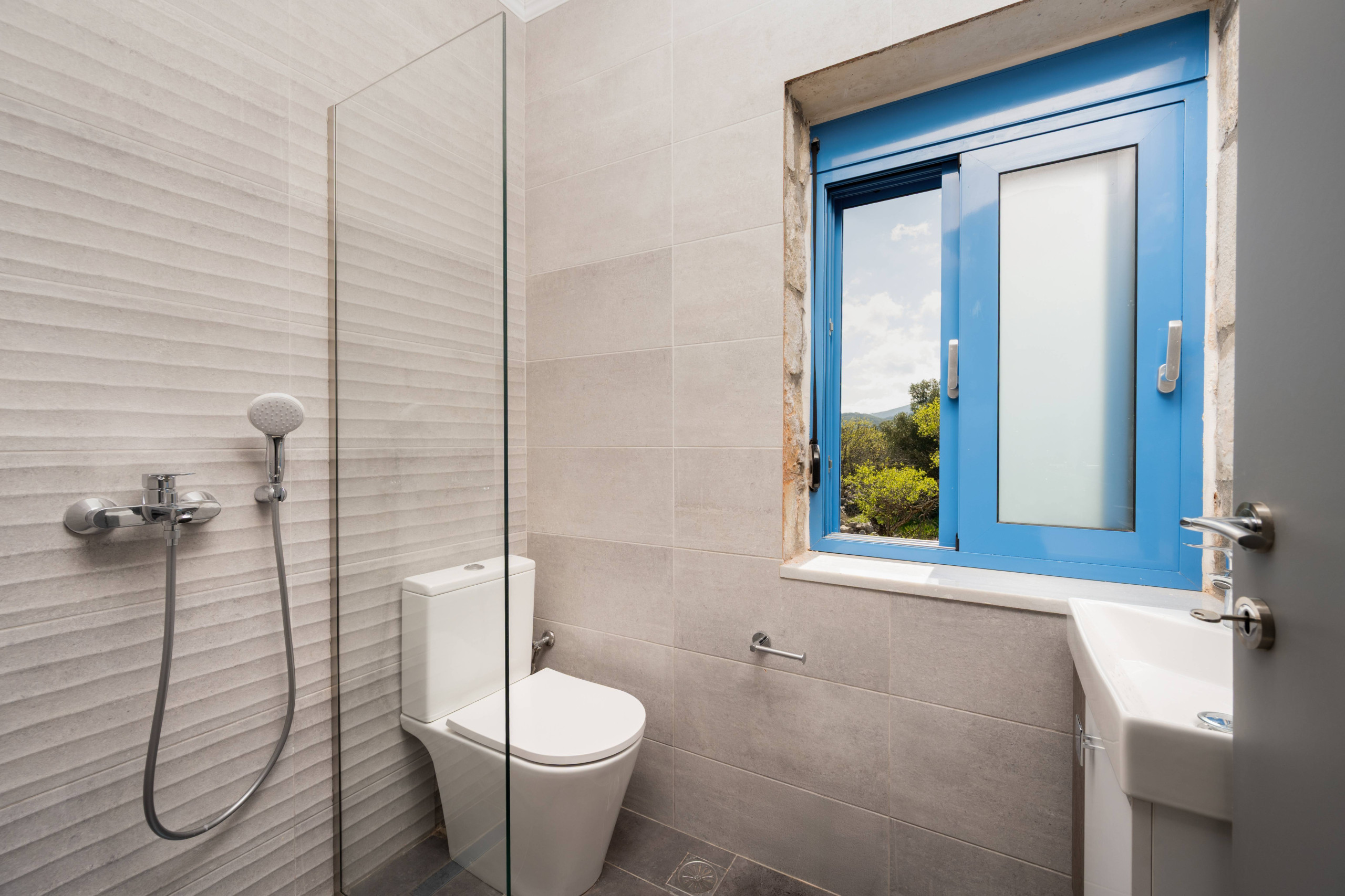 On the top floor, you will find a bedroom with a queen-size bed, air conditioning, TV, and a private bathroom with shower. This level opens onto a spacious balcony with panoramic sea views, offering a wonderful spot to relax, enjoy your morning coffee, or admire the sunset over the Ionian Sea.